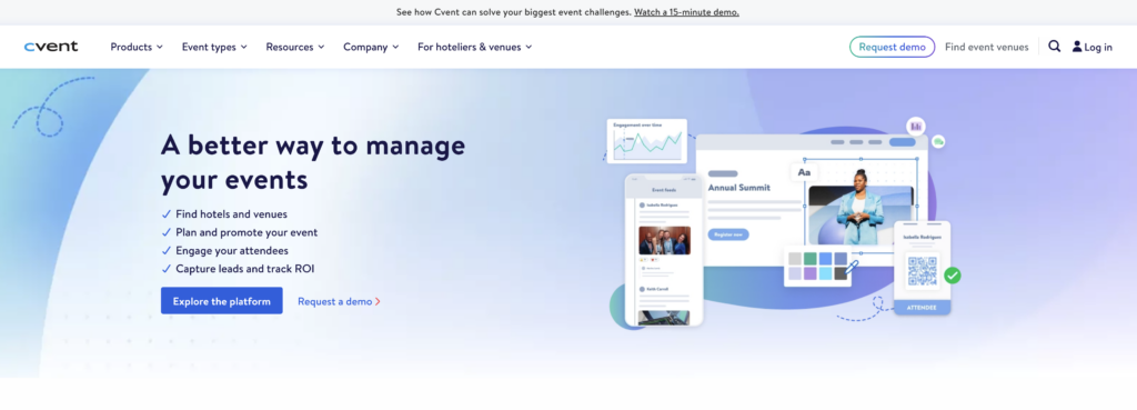 Cvent est une plateforme destinée à la gestion d’événements professionnels de grande envergure. Elle est particulièrement utilisée pour les conférences, forums et galas, et convient aux municipalités qui organisent des événements complexes avec plusieurs intervenants, lieux et types d’inscriptions.