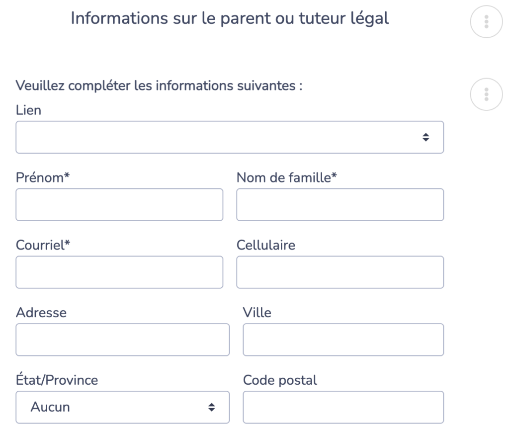Commencez par une section simple, qui permet d’identifier le participant ou le tuteur légal. Prévoyez les champs suivants :