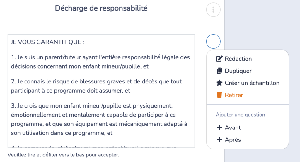 Indiquez clairement que le participant renonce à toute poursuite envers votre municipalité, vos employés, bénévoles ou partenaires, en cas de blessure ou de dommage subi pendant l’activité. C’est cette clause qui protège juridiquement votre ville.