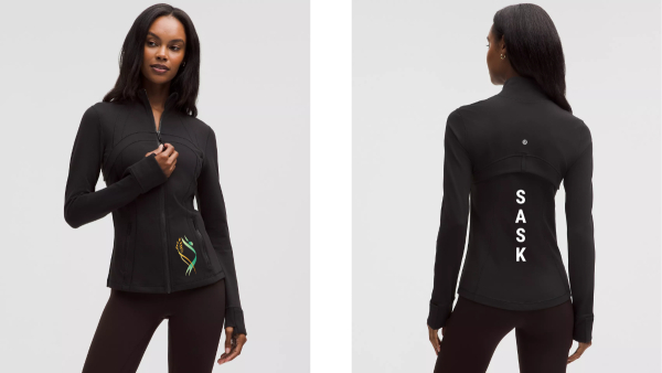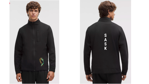 Adidas green, small logo on front with TEAM SASK on back. No longer the current Team Sask track jacket.