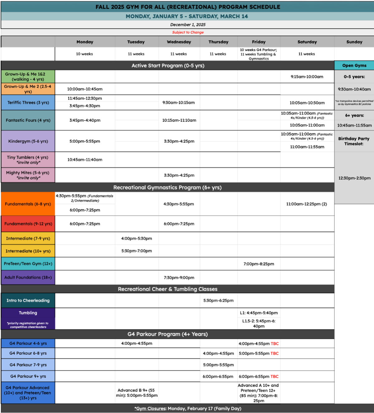 Winter 2026 Session Class Times and pricing will be updated by Monday, December 8.