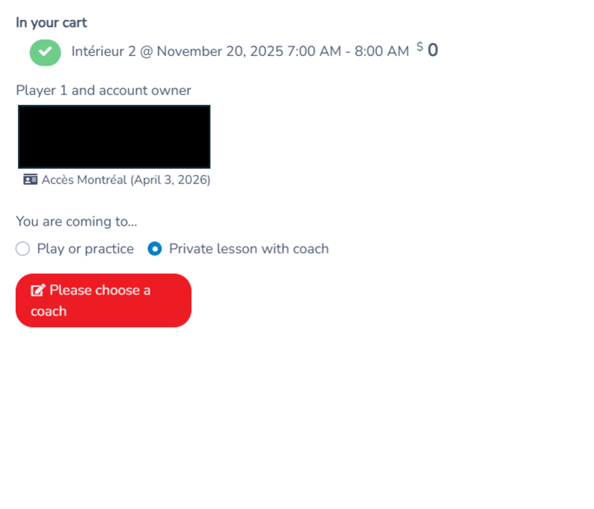 First, you will need to visit the Tennis MontrĂ©al website to view profiles and contact coaches to confirm their availability. When booking a court on the IGA Stadium website, you will be asked to indicate whether you wish to use this rental for a private lesson: you will then select your coach. Please note that users wishing to take advantage of this offer will not have any advantage in reserving their court and will still be limited to one (1) or two (2) hours in accordance with the current Terms of Use. Â