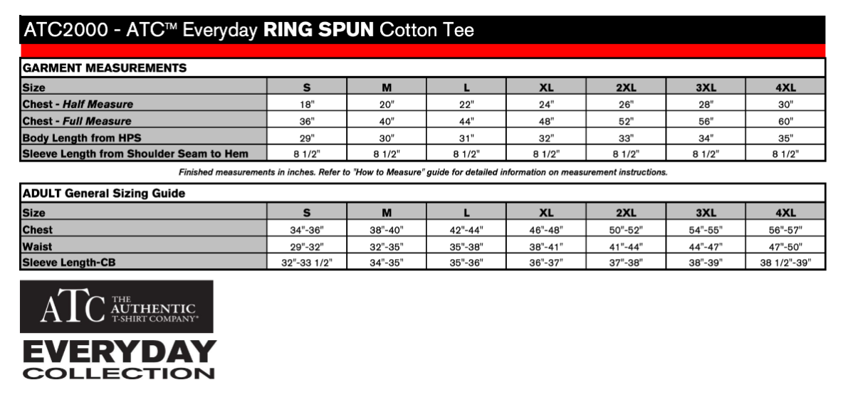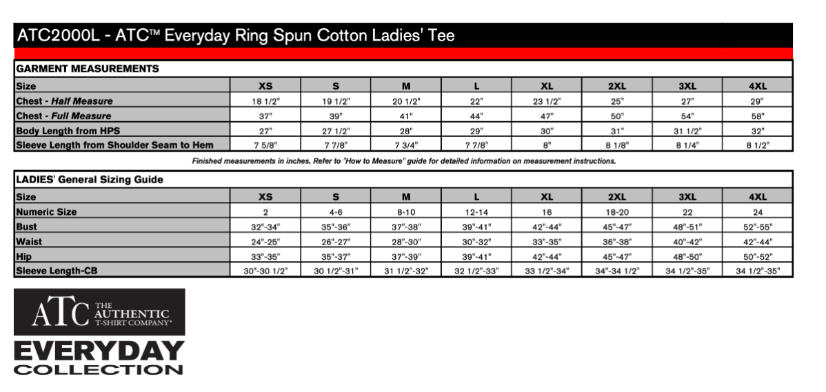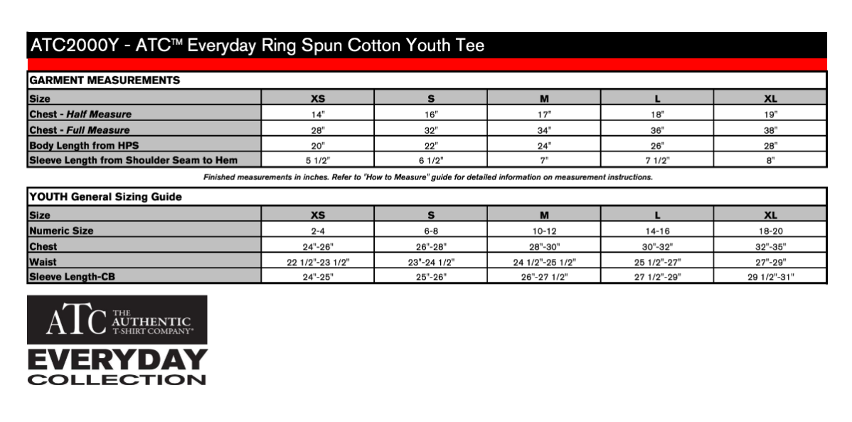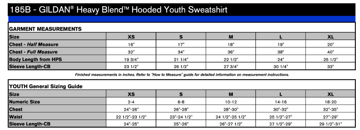 Listed below are sizing specs for Youth Hoodie, Adult Unisex Hoodies, Ladies Tees, Youth Tees, and Unisex Tees