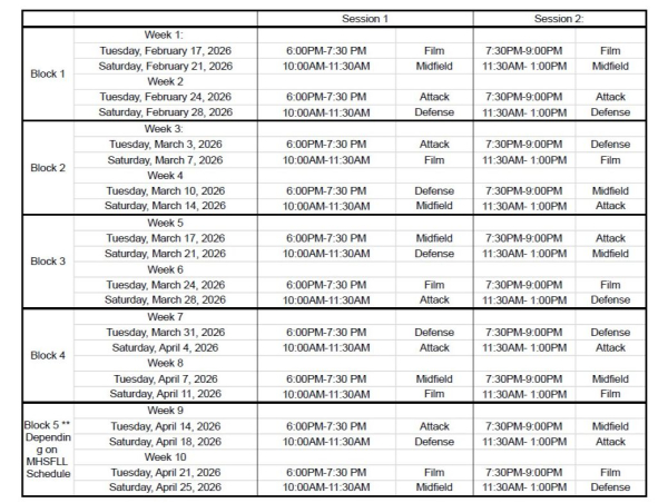 Within each block, there are eight total sessions offered, covering four different specialty areas (for example: Attack, Midfield, Defense, and Film).