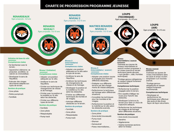 D’une durée de 120 minutes, ont pour but de développer et de parfaire les habiletés à vélo en s’amusant pour des jeunes cyclistes de niveaux débutant, intermédiaire et avancé.