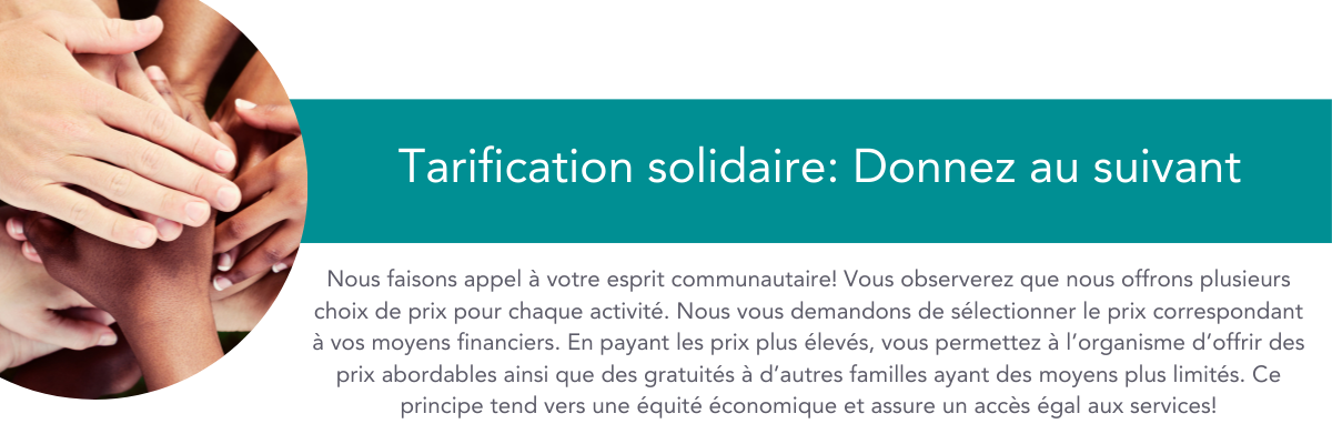 Veuillez noter que l'option de payer 125%, 150% ou 200% du prix recommandé nous permet d'offrir cette activité à une personne n'ayant pas la capacité de payer le plein prix de l'activité.
