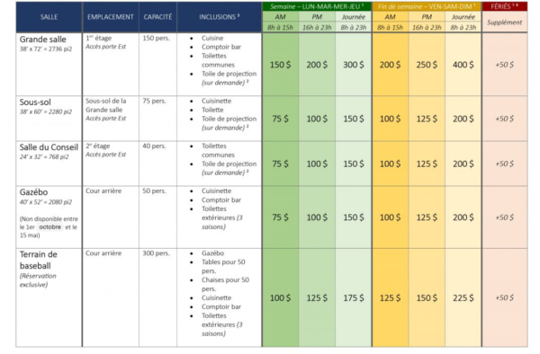 La salle vous est disponible uniquement pour les heures citées au contrat, à moins d’entente écrite particulière entre les parties. Il est interdit de vous y présenter en dehors de vos heures réservées. Si vous devez la décorer ou l’organiser avant la tenue de votre événement, vous devrez louer la plage horaire en conséquence. Une autre location pourrait avoir été planifiée avant la vôtre et ce groupe aura la priorité sur l’aménagement de la salle.
