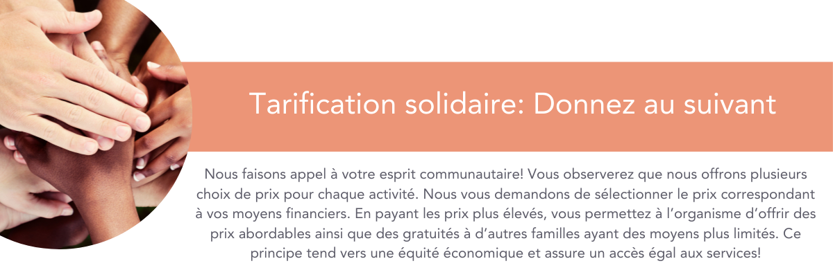 Veuillez noter que l'option de payer 125% ou 150% du prix recommandé nous permet d'offrir cette activité à une personne n'ayant pas la capacité de payer le plein prix de l'activité.