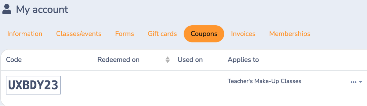 5. The class cancelation will provide a coupon that can be used to book a make-up class. Please contact your teacher directly to discuss a make-up class. Your teacher will add the make-up class date to their registration form for you to book with your coupon.
