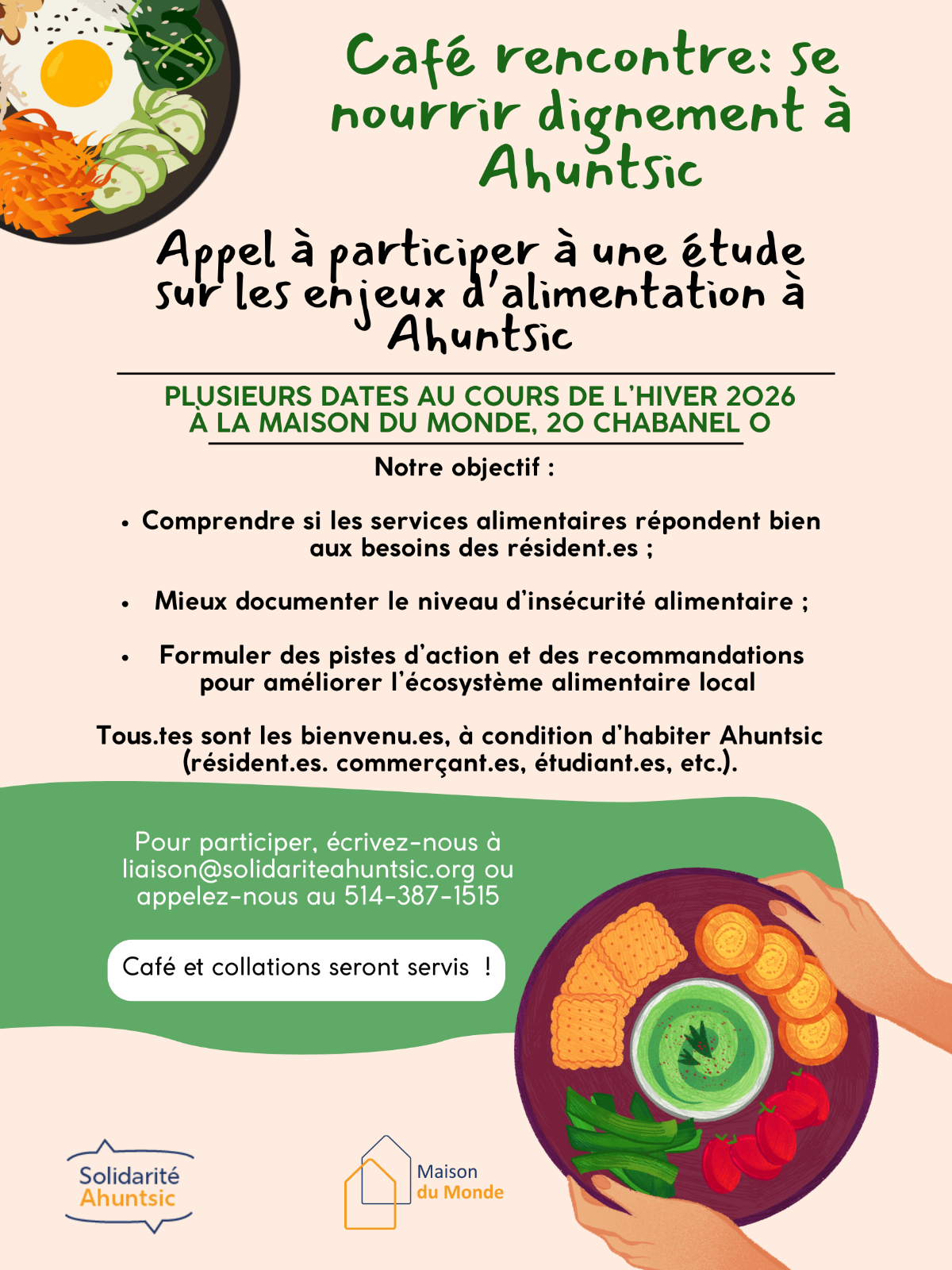 Solidarité Ahuntsic, en collaboration avec le Chantier de sécurité alimentaire, mène actuellement une étude sur la Sécurité Alimentaire et l'accès aux services en alimentation dans le quartier. Dans ce cadre, plusieurs cafés-rencontres avec pour thématique : Se nourrir dignement dans le quartier seront réalisés à la Maison du Monde au cours de l'hiver. Si vous avez des questions ou si vous désirez vous inscrire, écrivez Alexandre à liaison@solidariteahuntsic.org
