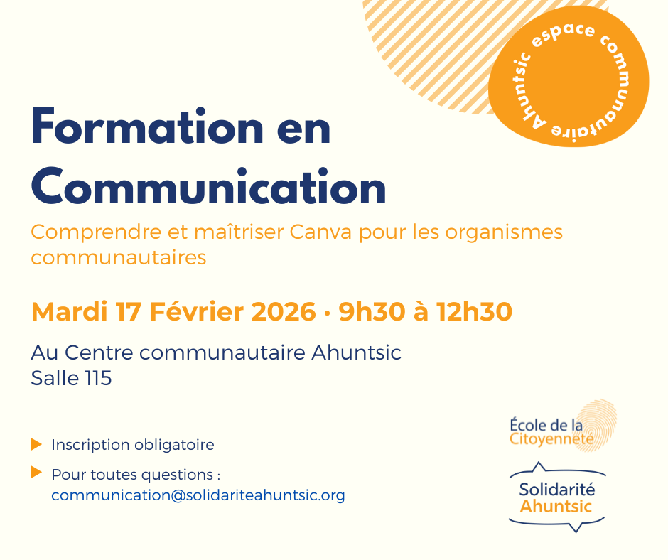Première formation d'une série de 4 formations en communication offerte aux organismes communautaire et groupes citoyens d'Ahuntsic. Pour la première nous nous attaquons à la base : Canva ! La formation sera composée de deux parties : une démonstration et un exercice pratique dans lequel vous pourrez composer une affiche en fonction de ce que vous avez appris.