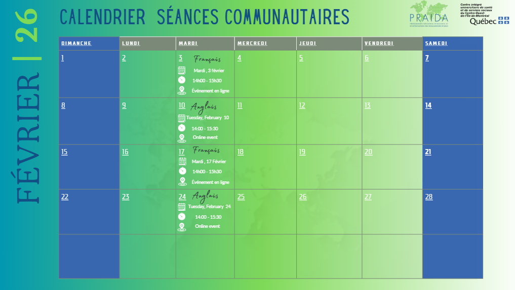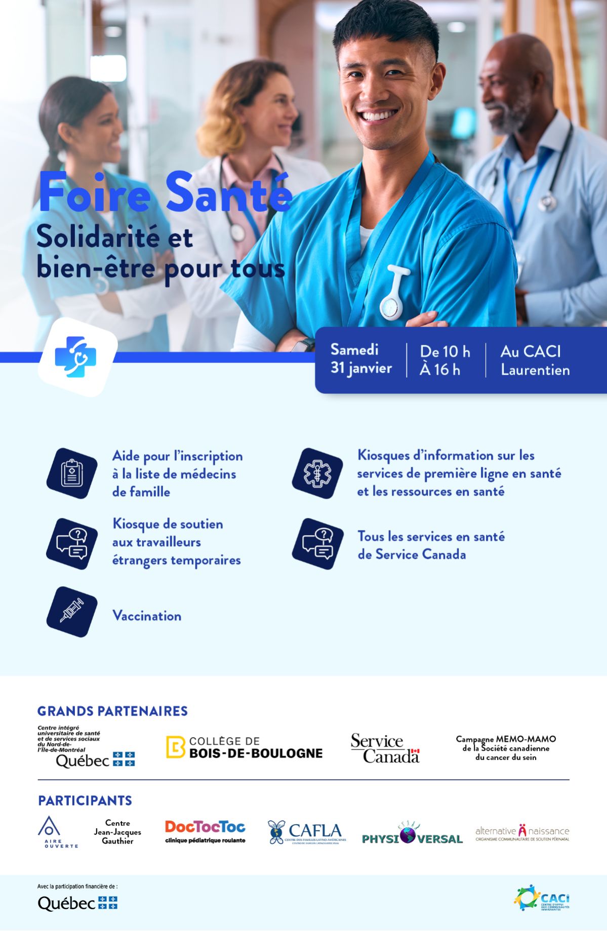Le CACI est heureux d’inaugurer la toute première édition de sa « Foire santé », réalisée en collaboration avec le CIUSSS du Nord‑de‑l’Île‑de‑Montréal et l’École de soins infirmiers du Collège Bois‑de‑Boulogne. Date : samedi 31 janvier 2026 Heure : de 10 h à 16 h Lieu : 4ᵉ étage Public visé : population en général, avec une attention particulière pour la clientèle du CACI, notamment les demandeurs d’asile, les travailleurs étrangers temporaires et les étudiants.