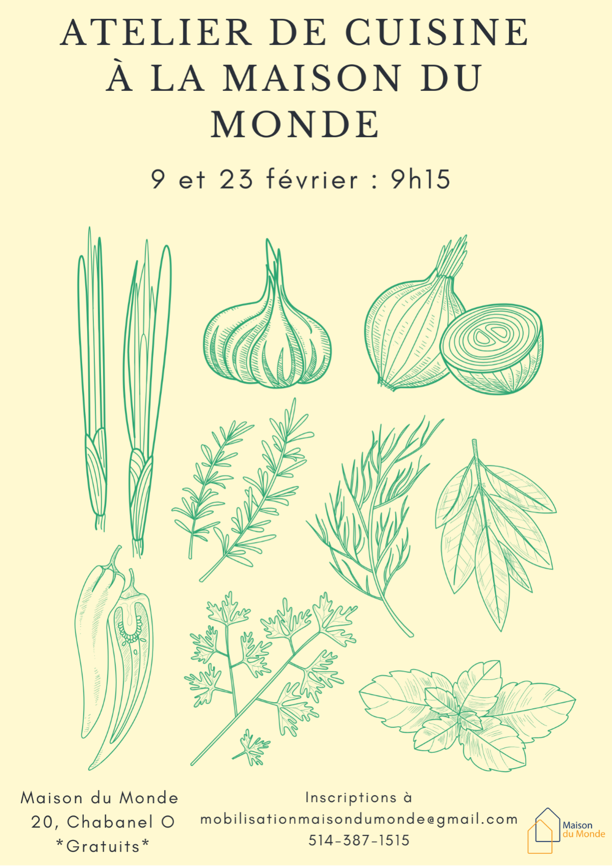 Venez découvrir les ateliers de cuisine de la Maison du Monde. Un lundi sur deux de 9h30 à 12h, venez partager un moment convivial et déguster une bonne recette. Chacune atelier offre deux nouvelles recettes : un plat princial et un dessert, que vous pouvez refaire facilement à la maison ! Pour s'inscrire ou en savoir plus, contacter Laurie à mobilisationmaisondumonde@gmail.com ou au 514 387-1515