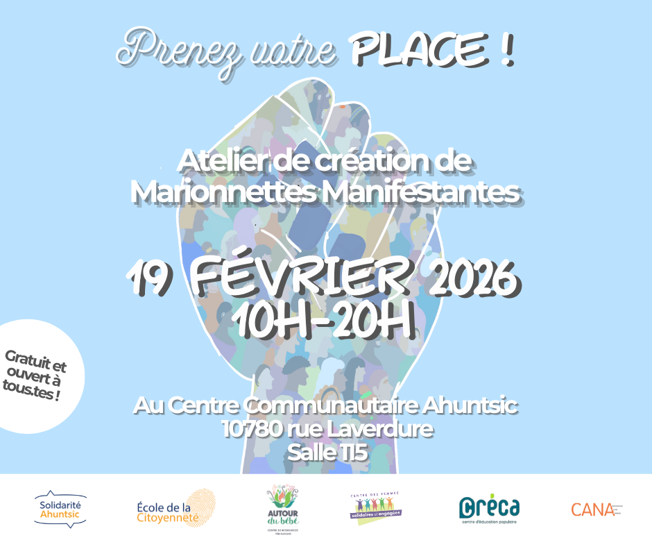 Cette année, pour la Journée Internationale Des Droits Des Femmes, venez nous aider à redonner de la place aux femmes. Rejoignez-nous pour créer votre Marionnette qui sera exposée dans l’espace public pendant la mobilisation du 10 mars 2026. Pour plus d'informations : impactcollectif@solidariteahuntsic.org