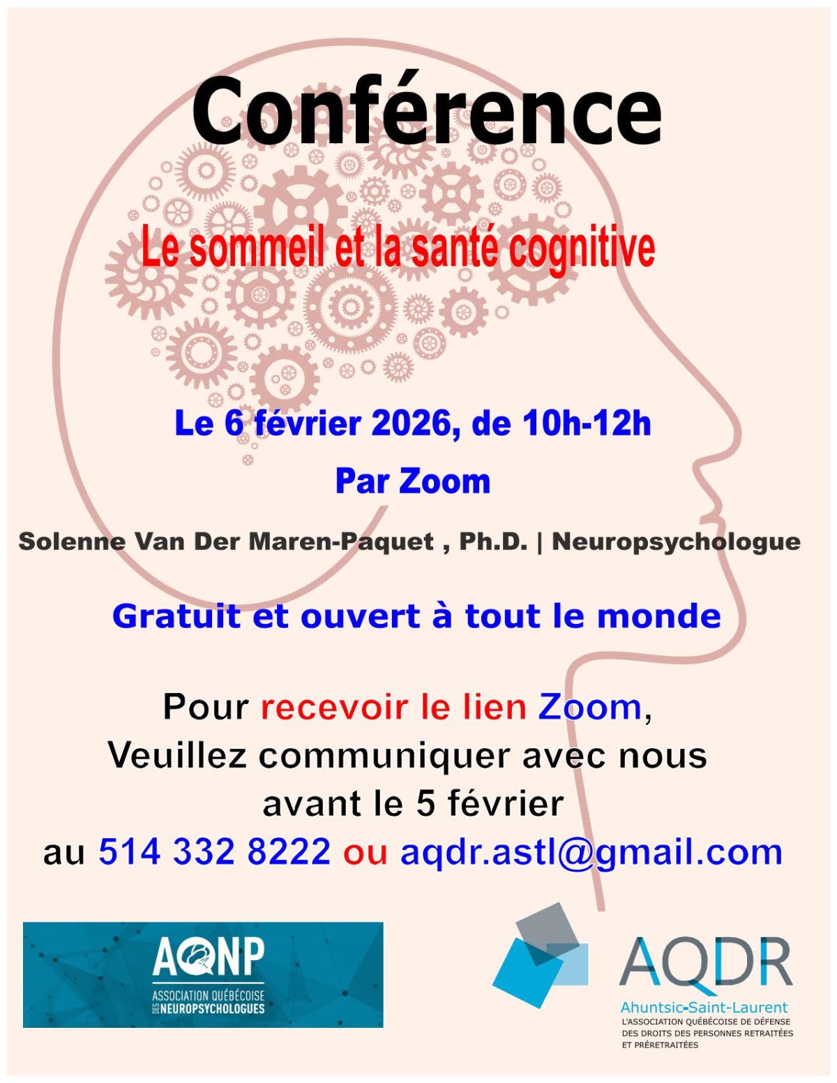 L'Association Québécoise de Défense des Droits de Personnes Retraitées d'Ahuntsic-Saint-Laurent vous propose une conférence sur le sommeil et la Santé Cognitive donnée par le Dr Solenne Van Der Maren-Paquet, neuropsychologue. Pour recevoir le lien zoom, communiquer avec l'AQDR STL avant le 5 février : 514 332 8222 ou aqdr.astl@gmail.com.