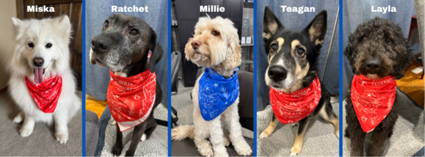 These doggos look amazing as they sport their custom AGF bandanas! Thank you so much for being a part of the Alberta Gymnastics community! β€οΈ