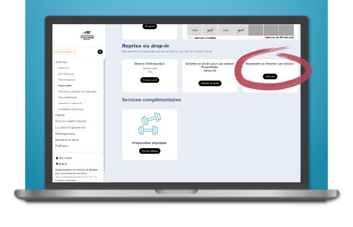 1. Rendez-vous sur la page Powerwatts, allez dans la section « Reprendre ou réserver une séance ».
