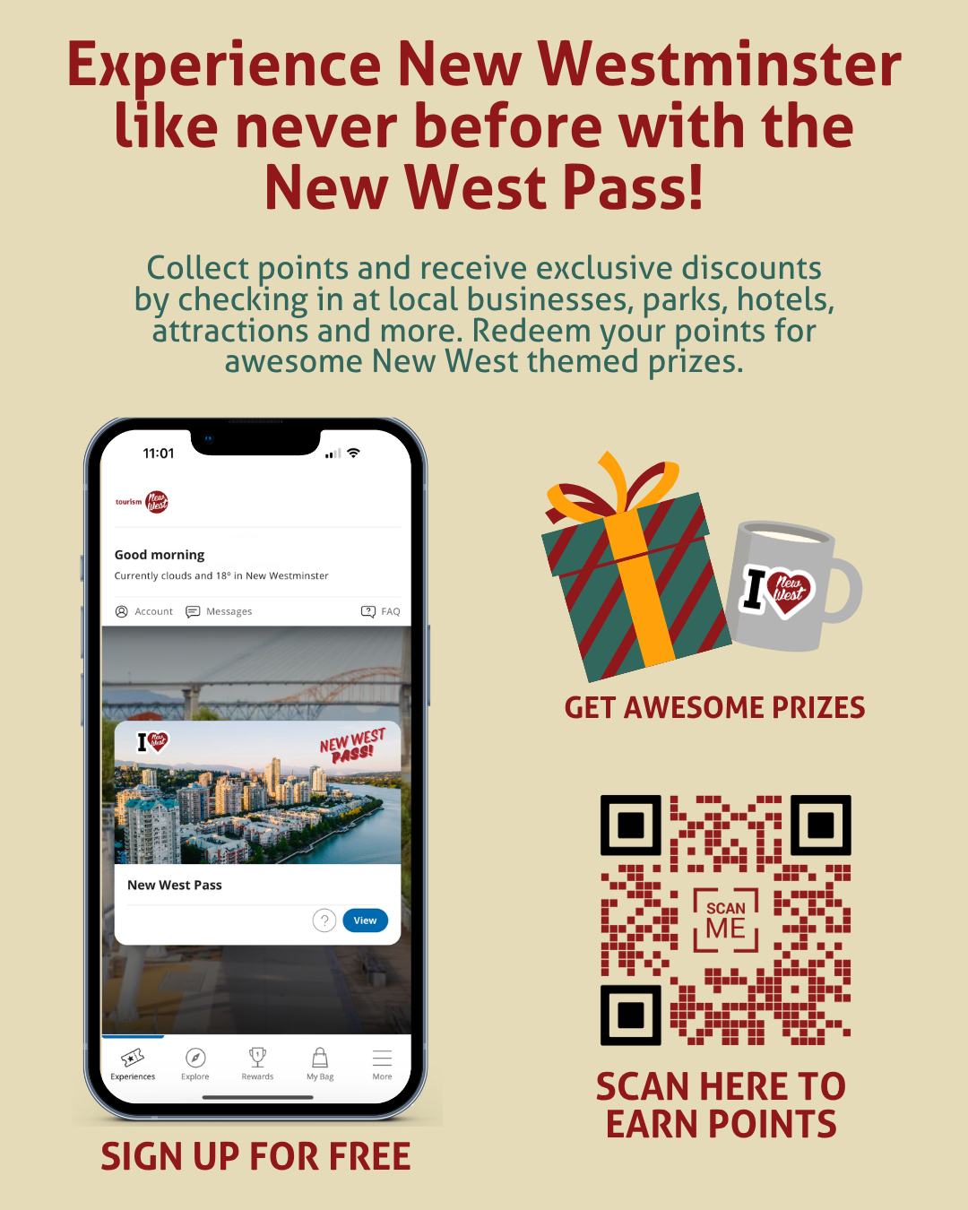 The New West pass is a free digital passport that unlocks exclusive discounts, local experiences, and rewards at businesses all across New Westminster. As you explore, you’ll continue to earn points toward fun, New West-themed prizes like mugs, tote bags, stickers, pins and our popular landmark postcards.