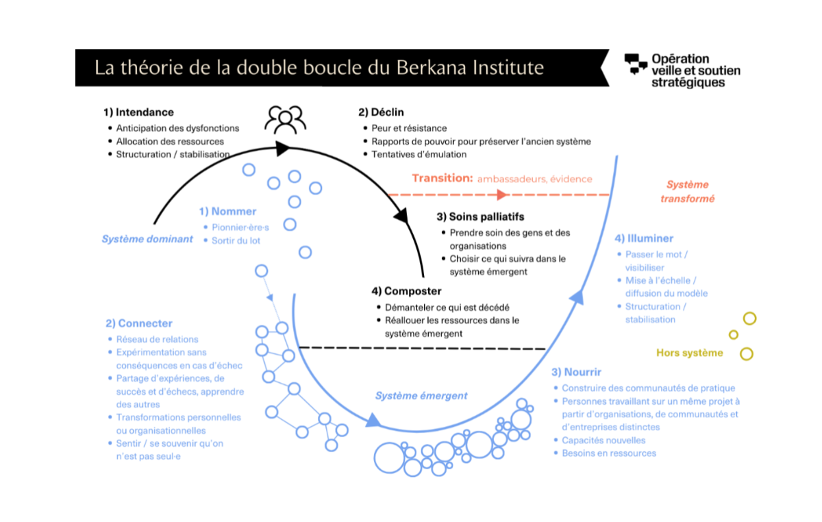 Explorer les changements systémiques autrement : la double boucleNotre collègue Pierre-Élie Hupé, de l’OVSS, signe une note praxis qui revisite la théorie de la double boucle du Berkana Institute. Une réflexion qui fait écho aux ateliers sur les changements systémiques que nous avons menés cette année avec Alain Meunier. Ce modèle montre comment un système dominant arrive en fin de cycle pendant qu’un système émergent prend forme – avec les deuils, les résistances, les germes d’avenir et le rôle clé des personnes qui tissent des ponts entre les deux. Pour ne rien manquer des productions de l’OVSS, abonnez-vous à son infolettre.