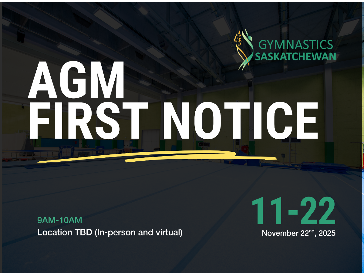 TO: Member ClubsRE: AGM First NoticeHello Member Clubs, The 2025 AGM Agenda and Board of Directors Nomination Information are now available on our website and at the links below: 2025 AGM Agenda Board of Directors Nomination Information The AGM will be held at 9AM-10AM in Regina, with in-person and virtual options for delegates to attend. We look forward to seeing all our members, whether in person or virtually, on November 22nd! Gymnastics Saskatchewan