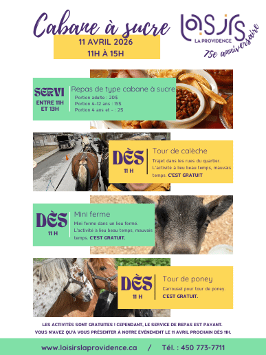Cabane à sucre - 11 avril 2026Nous vous invitons à participer à notre traditionnelle Cabane à sucre qui aura lieu le 11 avril prochain, de 11 h à 15 h ! Venez profiter d’une ambiance chaleureuse et festive pour célébrer le printemps. L’activité est gratuite et ouverte à tous. Un service de repas à coût abordable sera également offert sur place pour ceux qui souhaitent savourer un bon repas des sucres. On vous attend en grand nombre pour partager un beau moment en communauté !